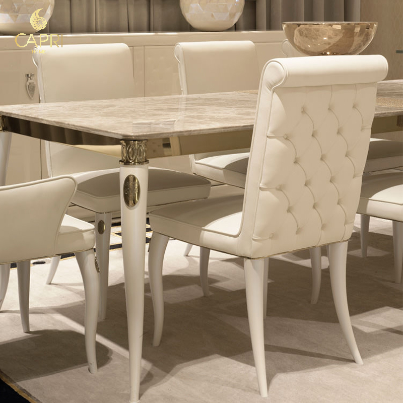 Bàn ăn cao cấp Ý sang trọng của Esmeralda được bọc bằng da với lưng thêu và đệm ngồi. Có sẵn với của chúng tôi mà không có thanh chéo. Bộ sưu tập đồ nội thất hiện đại sang trọng này kết hợp thời trang với đồ nội thất. Có nhiều loại vải và da cho bạn lựa chọn (có mẫu theo yêu cầu). Sản xuất tại Ý.