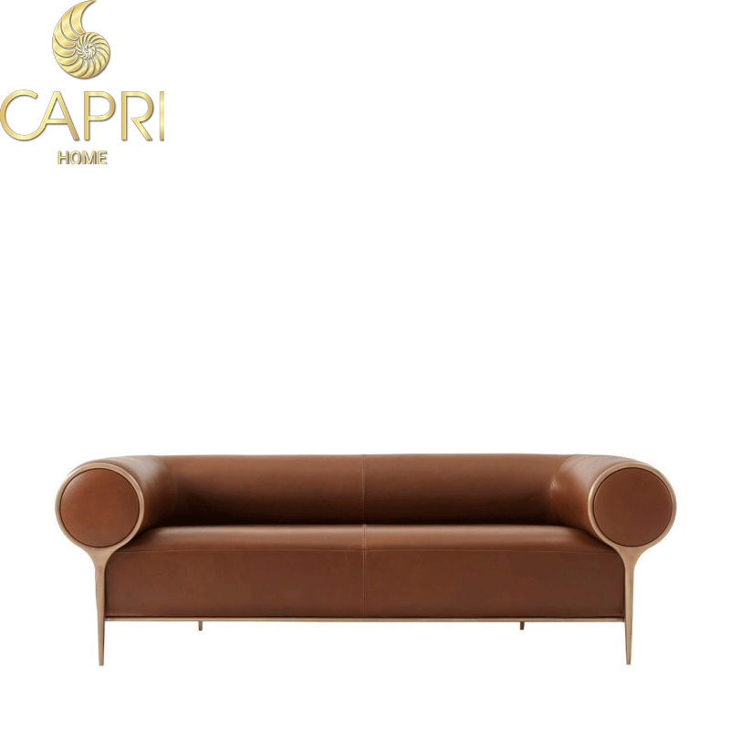 Ghế sofa cao cấp Loop Steve Leung Theodore Alexander đệm hình ống cuộn lại và cánh tay phía trên một chỗ ngồi ôm. Lưng và Để tay khi làm thon gọn Hỗ trợ Loop bao bọc người dùng. Khung được hoàn thiện tỉ mỉ. Được thể hiện bằng da Sepia-LE0331.